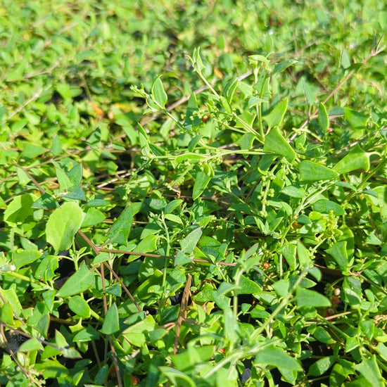 Einadia nutans, or Climbing Saltbush or Nodding Saltbush, is a low-growing, scrambling or climbing perennial native to Australia, often found in woodlands, grasslands, and along creek banks. This hardy plant features small, triangular green leaves and clusters of tiny, yellow-green flowers that bloom throughout the year, followed by bright red, berry-like fruits that are edible and attractive to wildlife.
