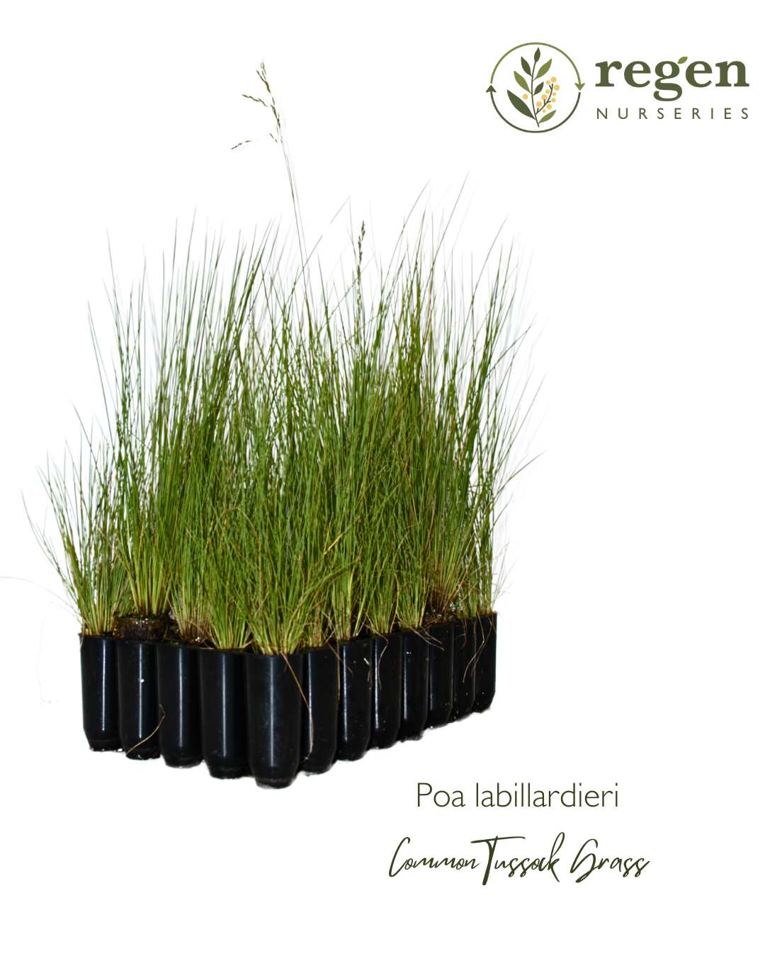 Poa labillardieri, or Common Tussock Grass, is a hardy, clump-forming perennial grass native to Australia, commonly found in grasslands, open woodlands, and riparian zones. Growing up to 1 meter tall, it features dense, fine-textured blue-green foliage and graceful, arching flower stems that produce soft, feathery seed heads in spring and summer, adding texture and movement to landscapes.